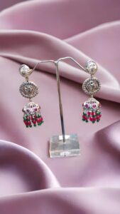 A touch of heritage and color — these handcrafted silver jhumkas feature ruby-red and emerald-green beads, blending traditional artistry with timeless charm.