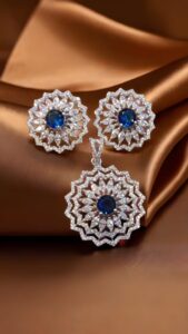Radiate timeless elegance with this sapphire-inspired design, featuring a brilliant floral motif surrounded by shimmering diamonds. Perfect for evening grace and regal charm.