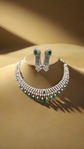 A stunning fusion of sophistication and splendor, this emerald and diamond necklace set captures the essence of refined luxury — ideal for grand celebrations.